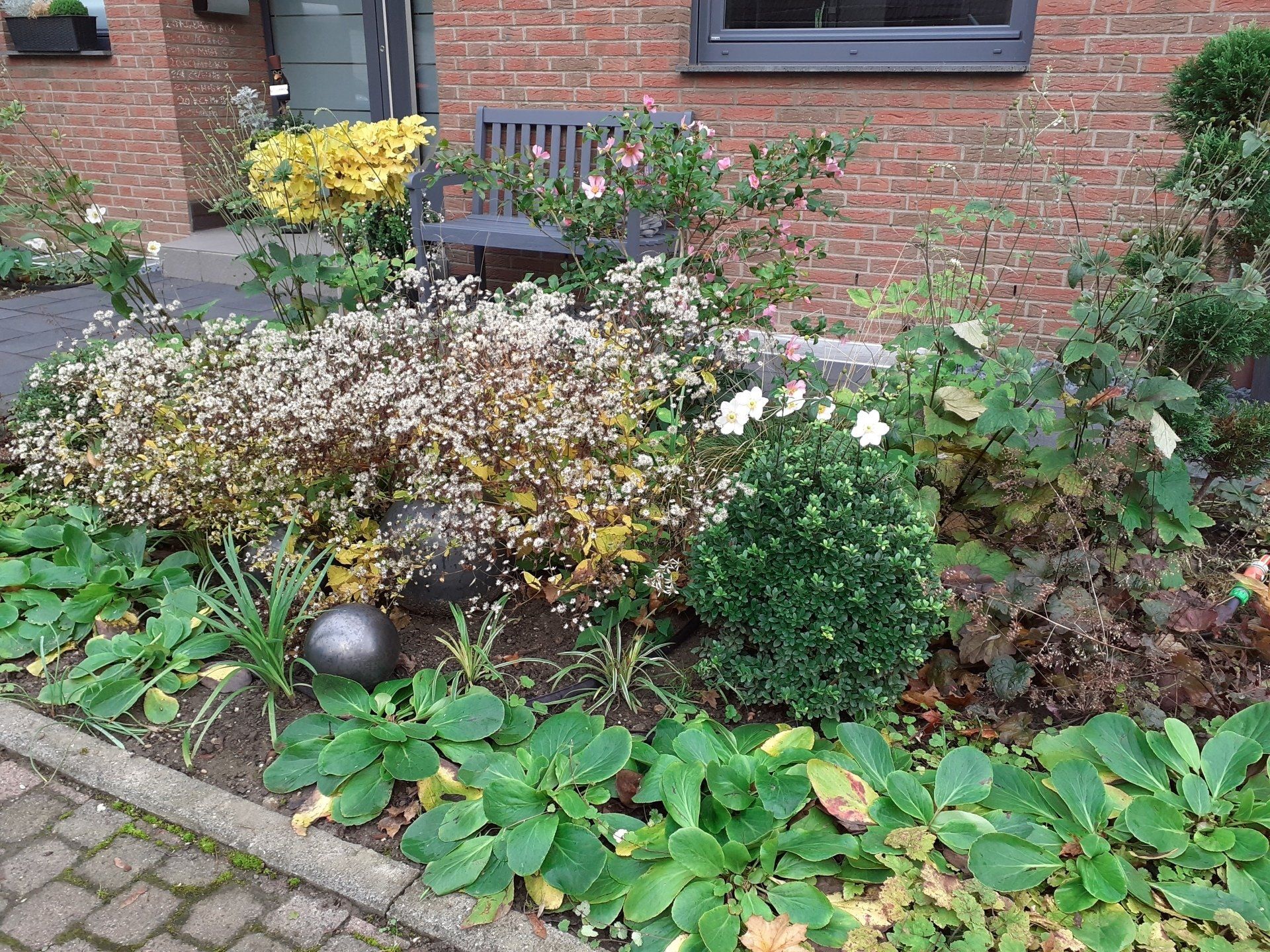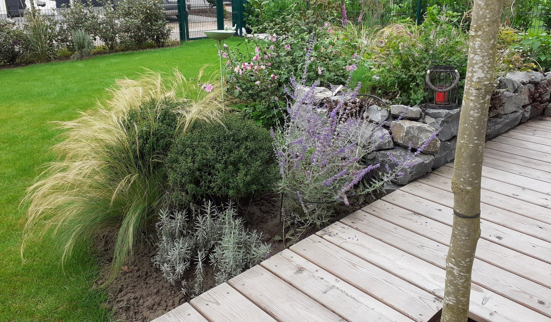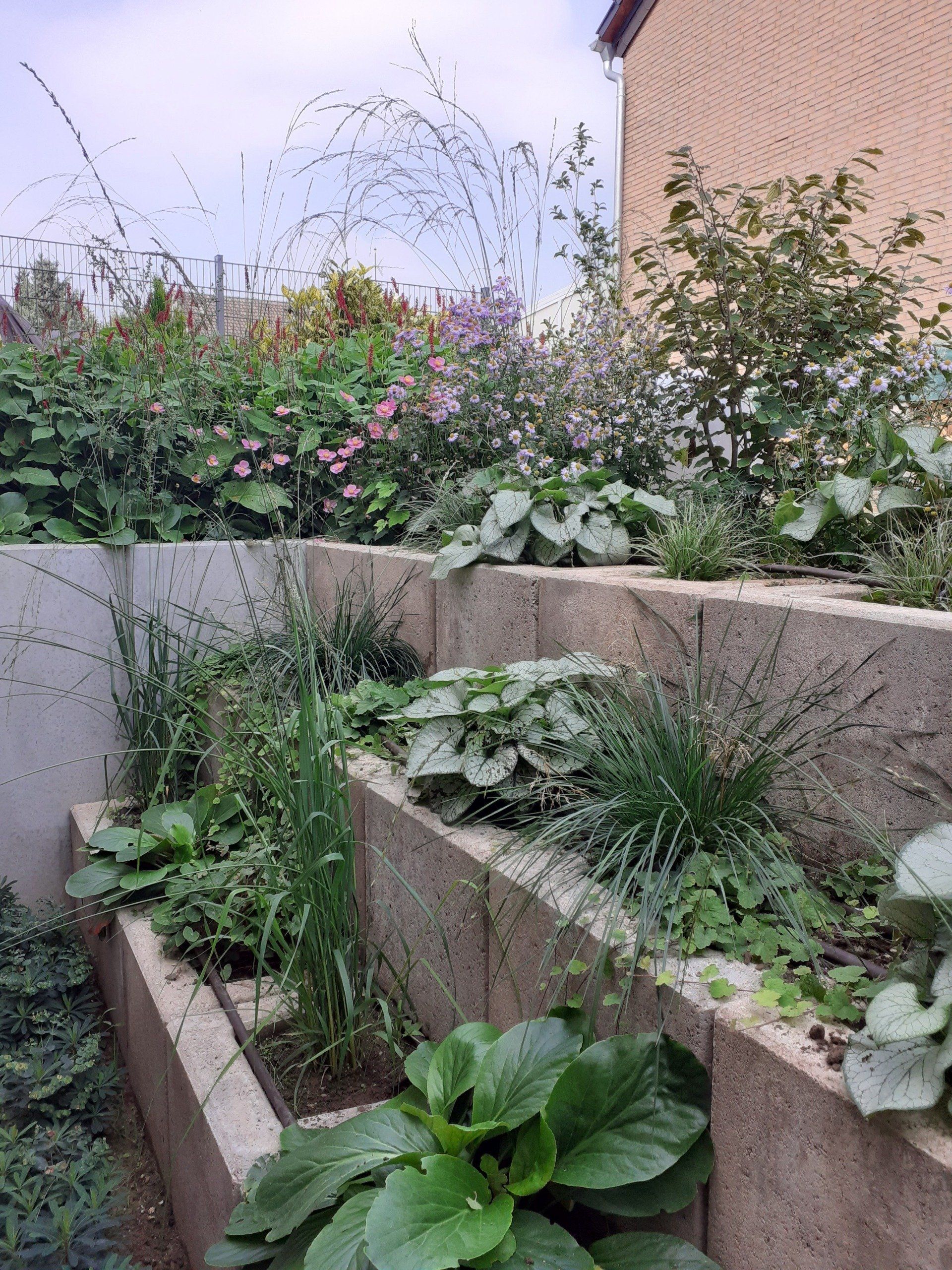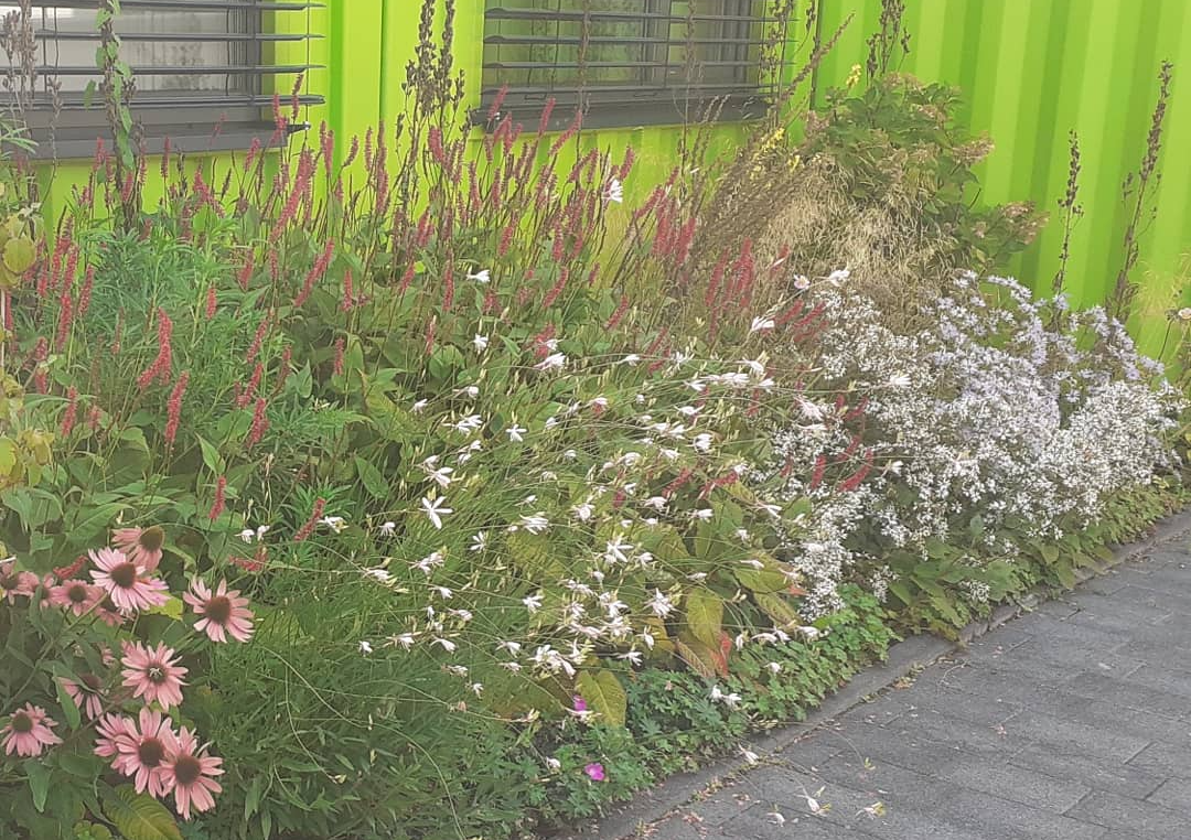 Gute Nachbarschaft, gerne ein wenig gemeinsam in schönem Ambiente vor der Hautür verweilen. Geschützt und doch mit guter Aussicht beleben diesen Ort nicht nur tolle Menschen, sondern auch Trockenheitskünstler unter den Stauden und Gehölzen.