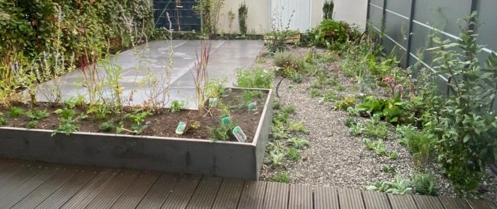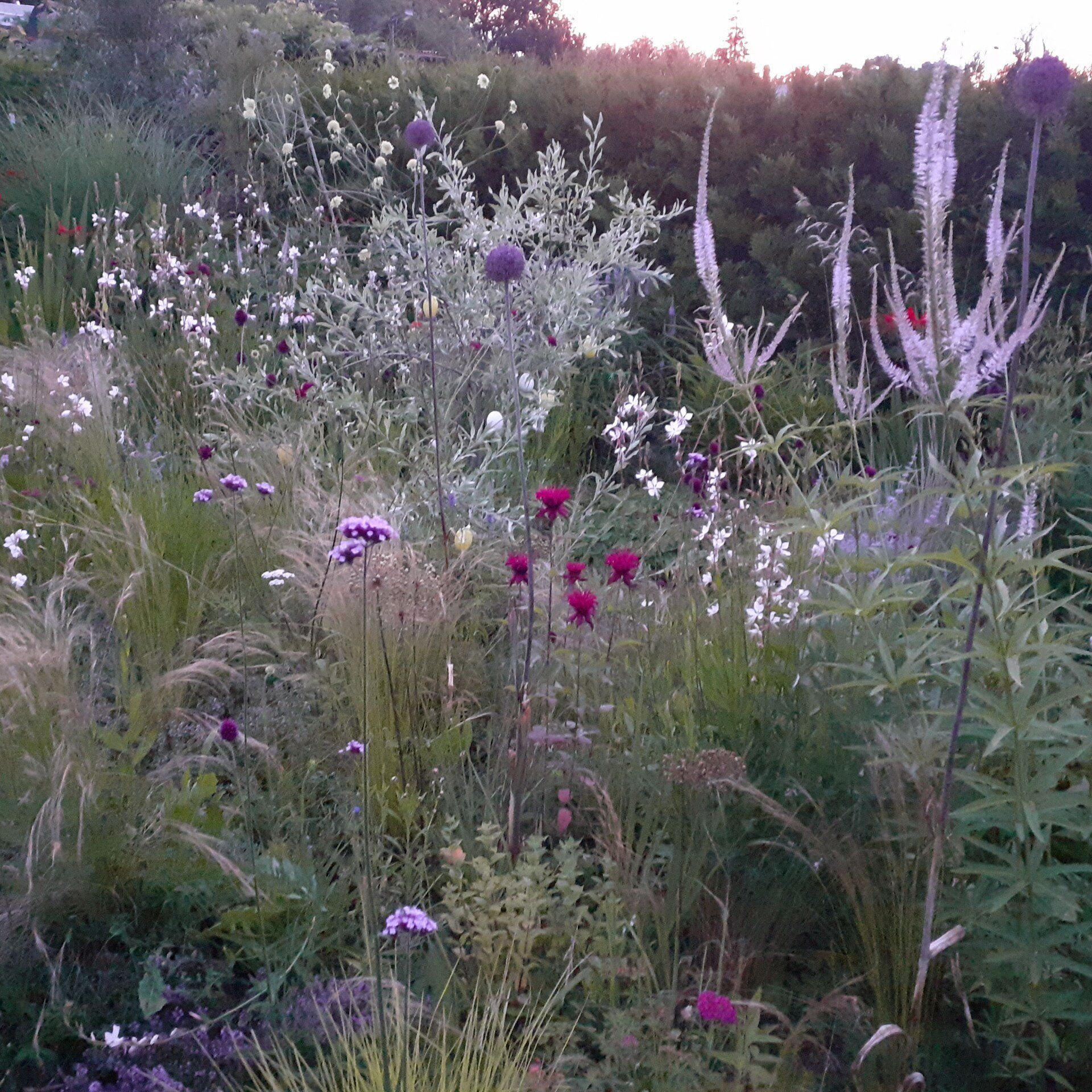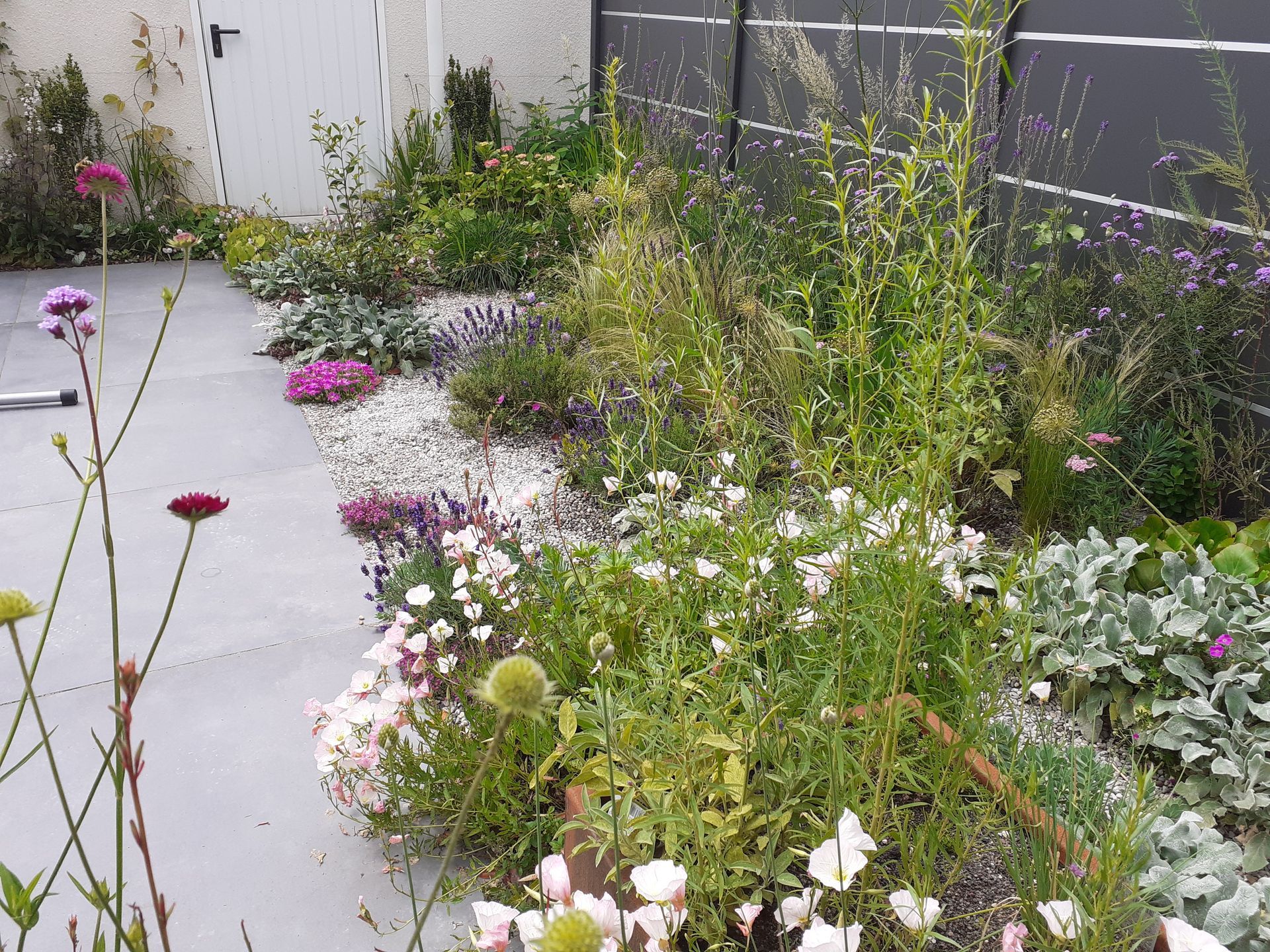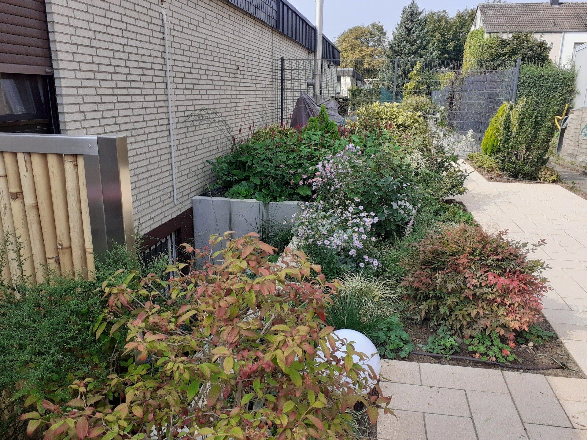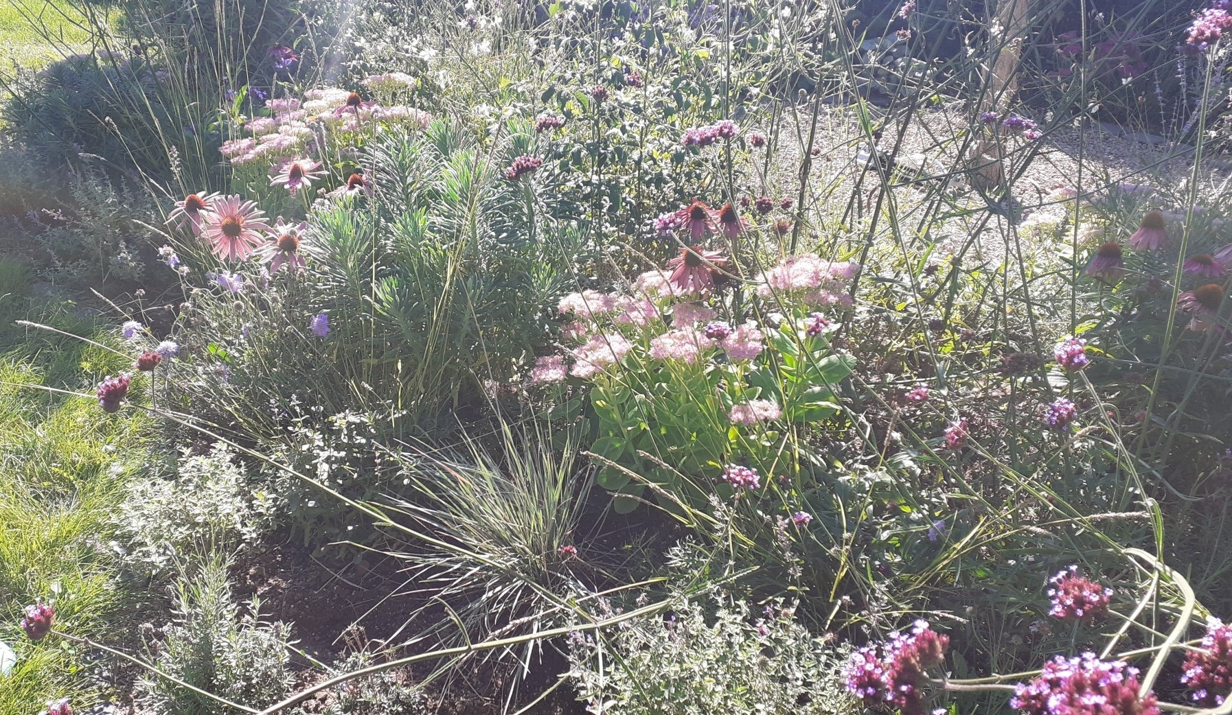 Gute Nachbarschaft, gerne ein wenig gemeinsam in schönem Ambiente vor der Hautür verweilen. Geschützt und doch mit guter Aussicht beleben diesen Ort nicht nur tolle Menschen, sondern auch Trockenheitskünstler unter den Stauden und Gehölzen.