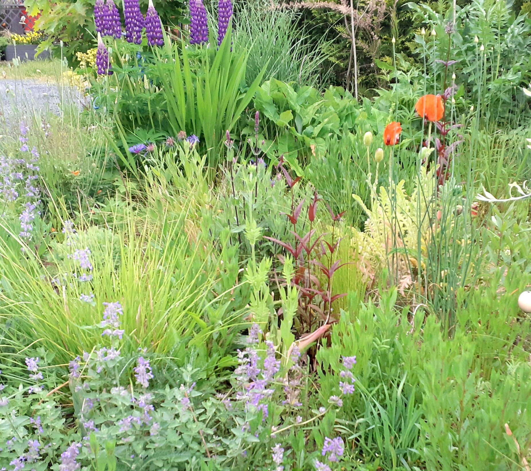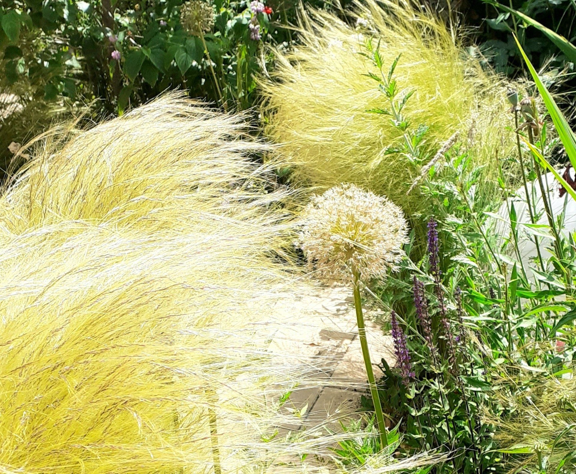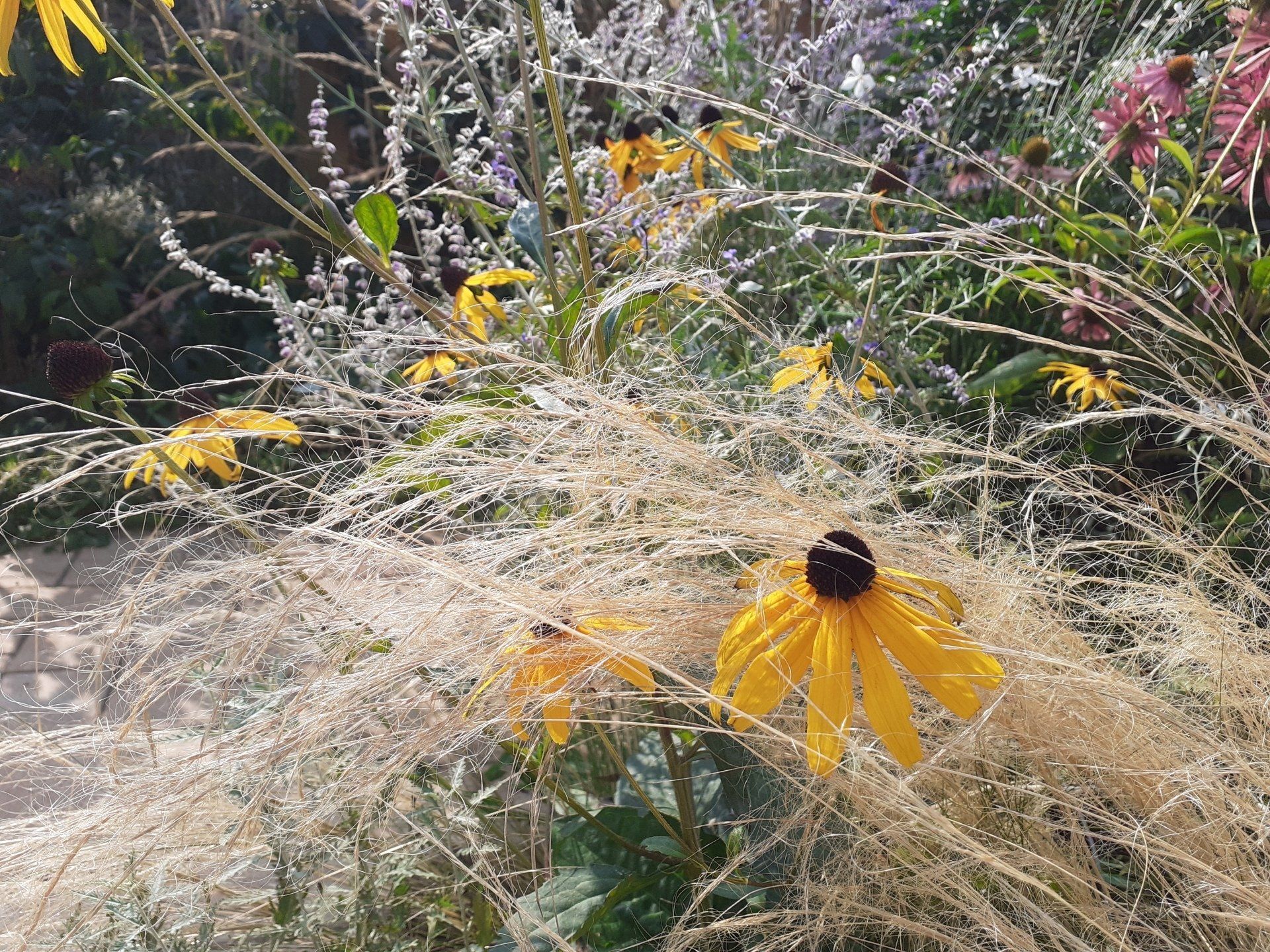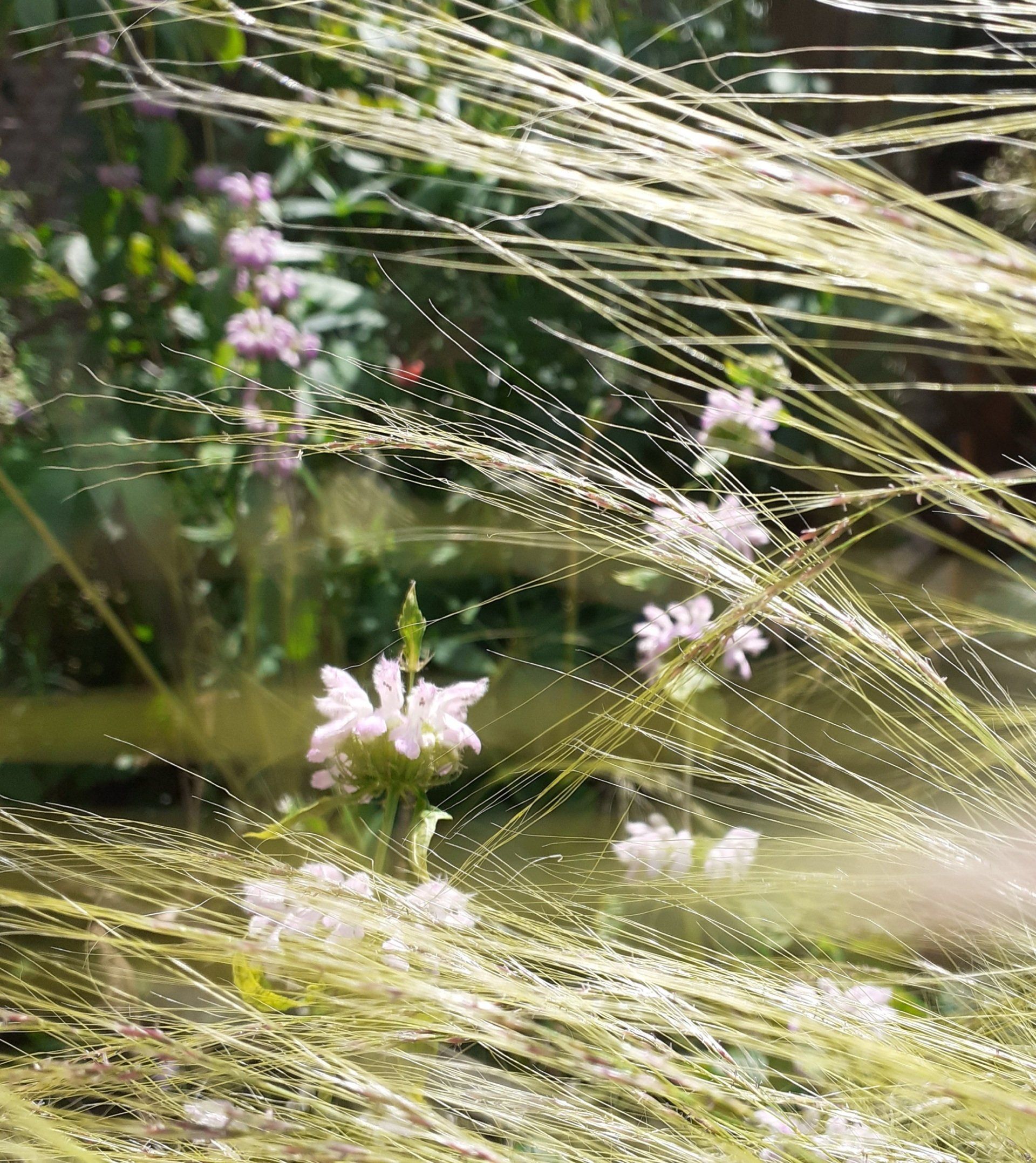 Gute Nachbarschaft, gerne ein wenig gemeinsam in schönem Ambiente vor der Hautür verweilen. Geschützt und doch mit guter Aussicht beleben diesen Ort nicht nur tolle Menschen, sondern auch Trockenheitskünstler unter den Stauden und Gehölzen.